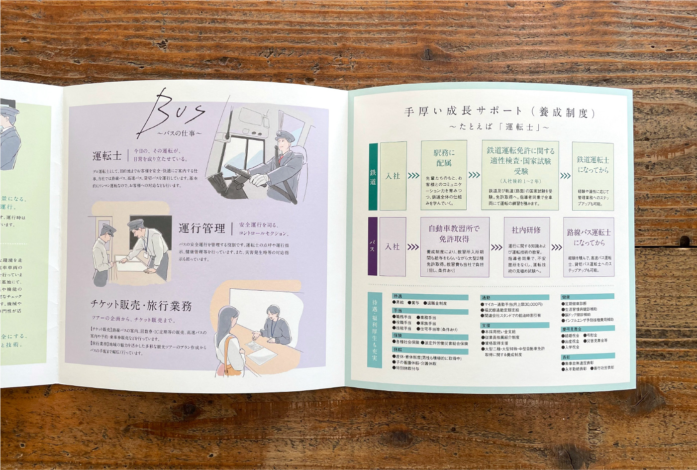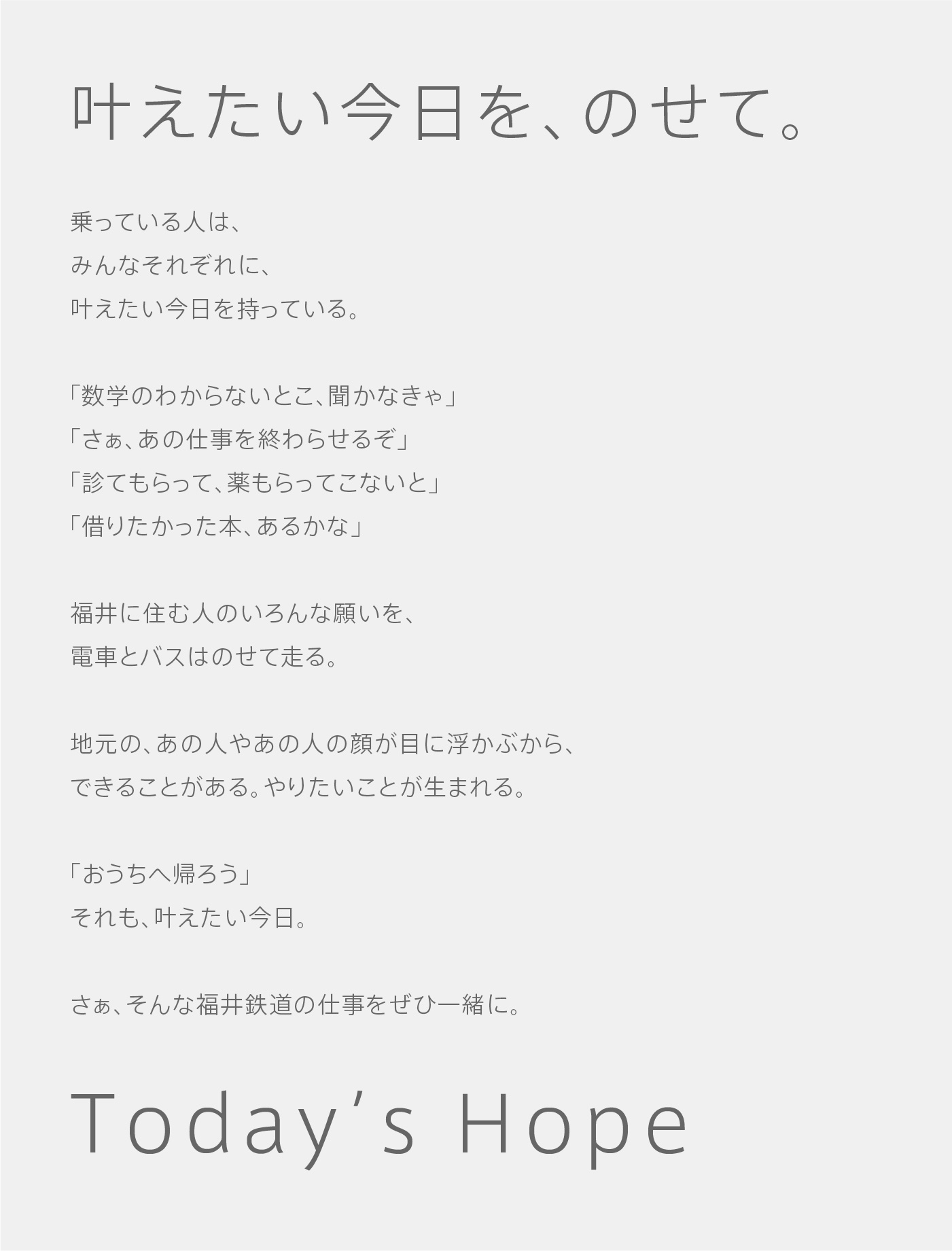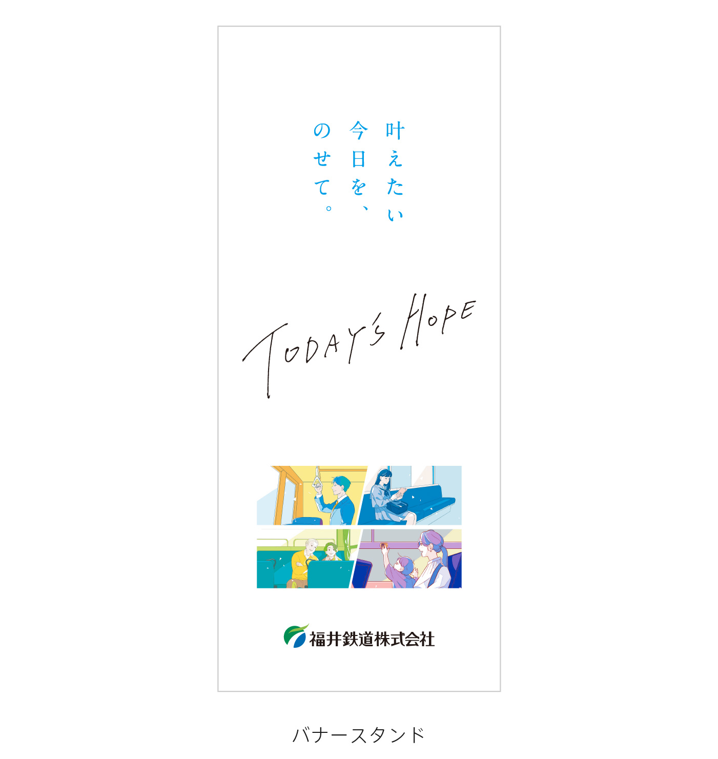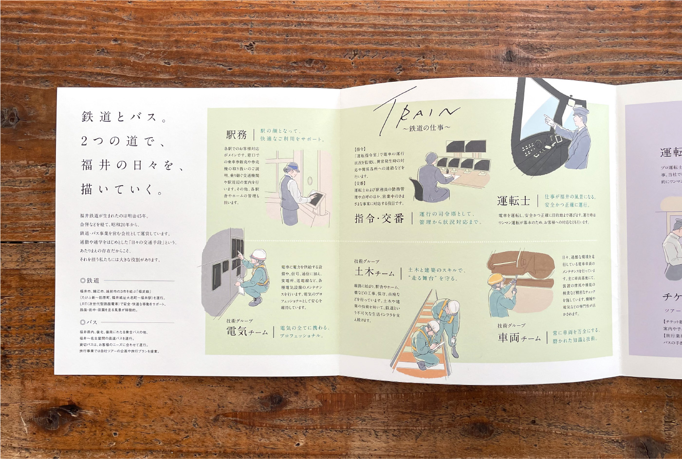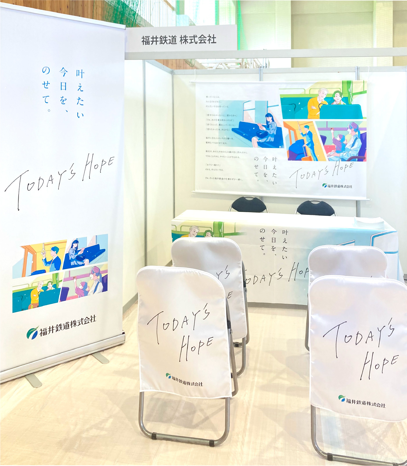 鉄道とバス。福井県民にとって欠かせない2つの交通手段を運営・運行する福井鉄道。100年の歴史を持ち、日々、県民を乗せて走っています。少子化の昨今、激化する採用活動においてどんなメッセージを放つべきなのか、社内に醸成するべきなのか。糸口を探るため、強い志を持って入社した若手社員や会社を支え続ける中堅社員にヒアリングを実施。街の人への気持ちや、地元のこれからへの願いが、いつのまにか「社会貢献」という4文字に含まれてしまっていることに気づきました。どこかに行くために乗車する人は、どんなに小さくても何か「叶いたいもの」を持っている。それを、それぞれが大切に届けている福井鉄道の姿勢をコンセプトへ。繊細な想いをWitDesignさんに(実際に電車とバスに乗ってもらった上で)イラストにて表現してもらいました。キービジュアルを軸に、パンフレット、採用ブースを作成。作り上げたメッセージやビジュアルは、webやSNSなど多様な場所で活用してもらっています。