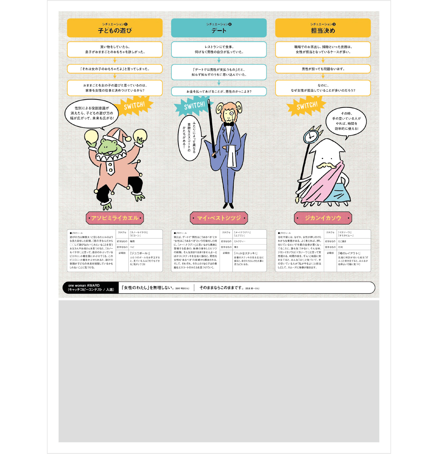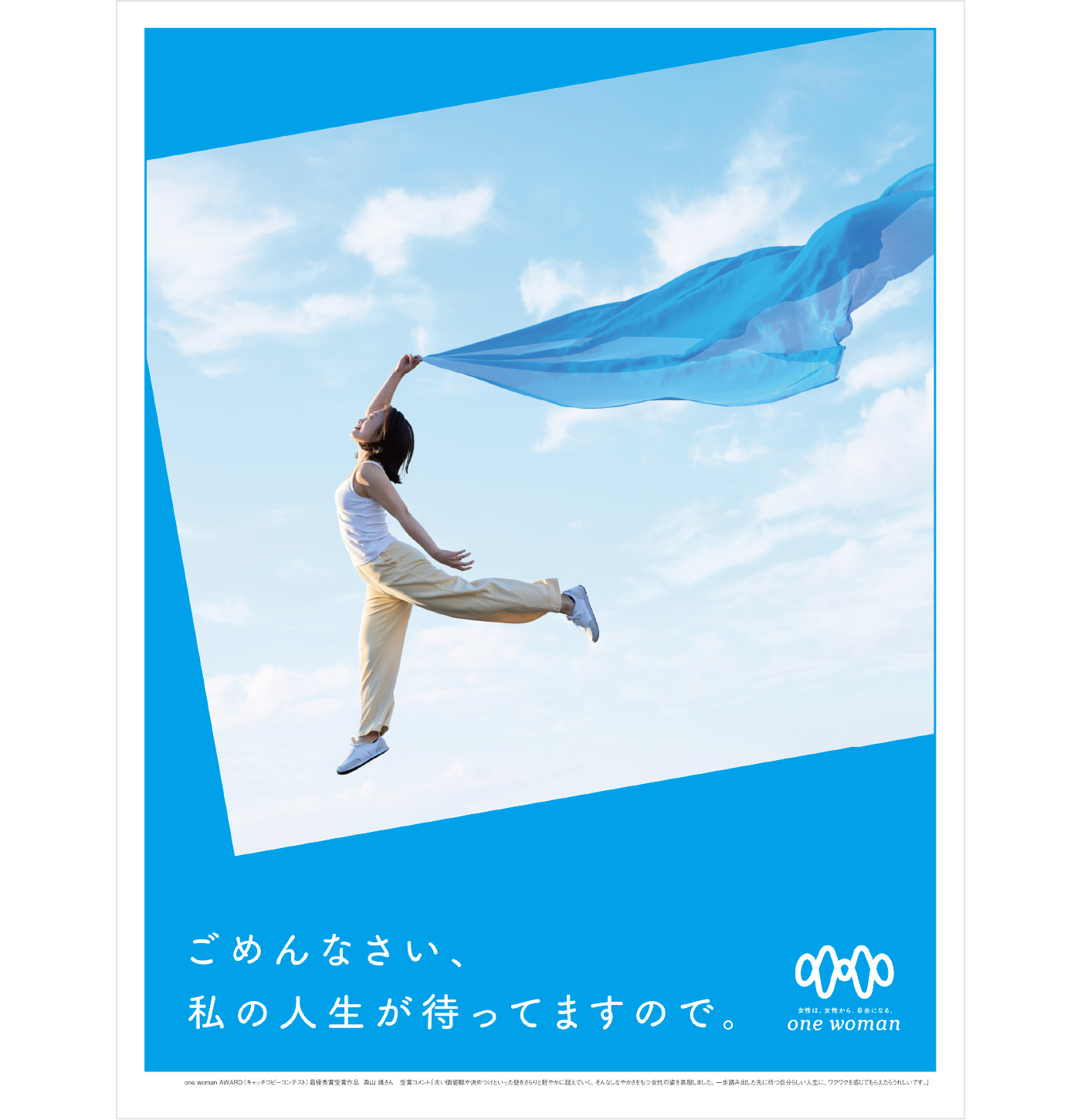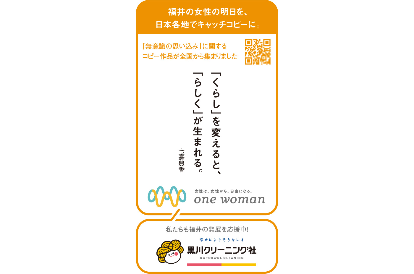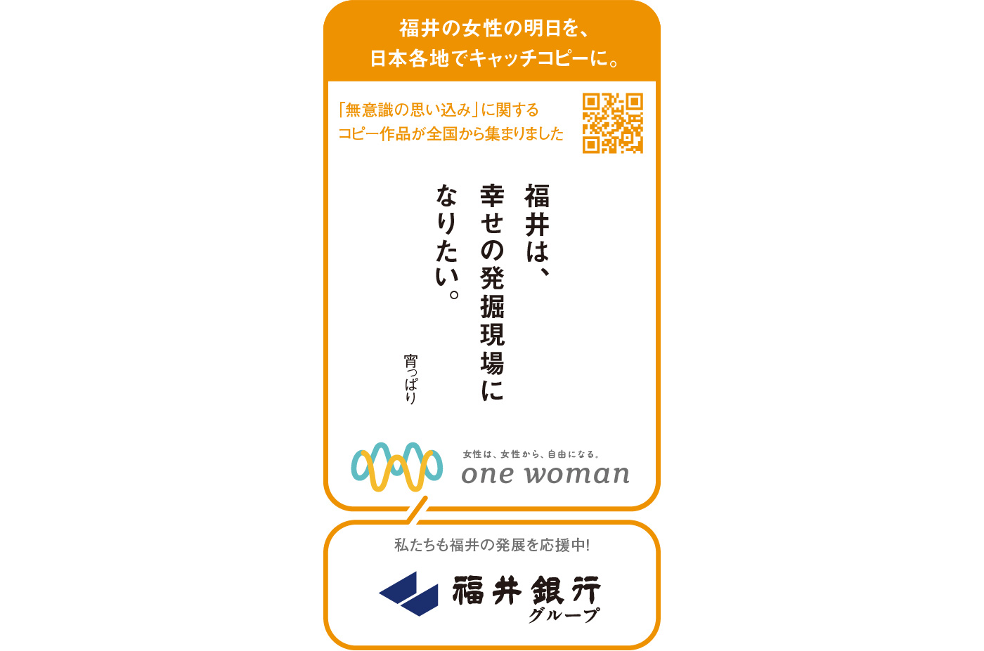 そのアクションは、福井新聞社で働く女性の一人が手を挙げたことから始まりました。課題は、「昨今、女性を中心とした若者に多い、地方からの転出」。あるデータによると、県外転出の背景には、地方ならではの「性別による役割分担意識」や「自分の望むキャリアをつめないように感じる」などのことがあるとわかります。アクションの軸として「無意識の思い込み(アンコンシャス・バイアス)」を据え、構築をスタートしました。まず、アクションのタイトル。発起人の女性とともに、課題をできるだけ短く、明確にすることを目指し、「one woman」と設定しました。つづけて、コトを生み出す言葉になることを念頭に、また、できるだけジェンダーから逃げないことを課して、コンセプトコピーをつくりました。「女性は、女性から、自由になる。」そして、ビジュアルの方向性・世界観の基軸をつくる、ミルククラウンをモチーフにしたロゴを開発。平面のデザインですが眺める場所によって「W」に見えたり「M」に見えたりすることの示唆を狙いました。そこから、気づきを集めるべく、県内外からエピソードを集めたり、キャッチコピー作品を募集したり、企業内の仲間や身近なメンバーでディスカッションを行ったり、各企業で新しい活動を生み出すなど、日常を振り返ってふと気づいてもらうアクションが多様に展開されていきました。まだ道半ばですが、こうして気づき始まった流れが、より大きくかたちになっていくことを願い、可能な限りサポートを行っていきます。