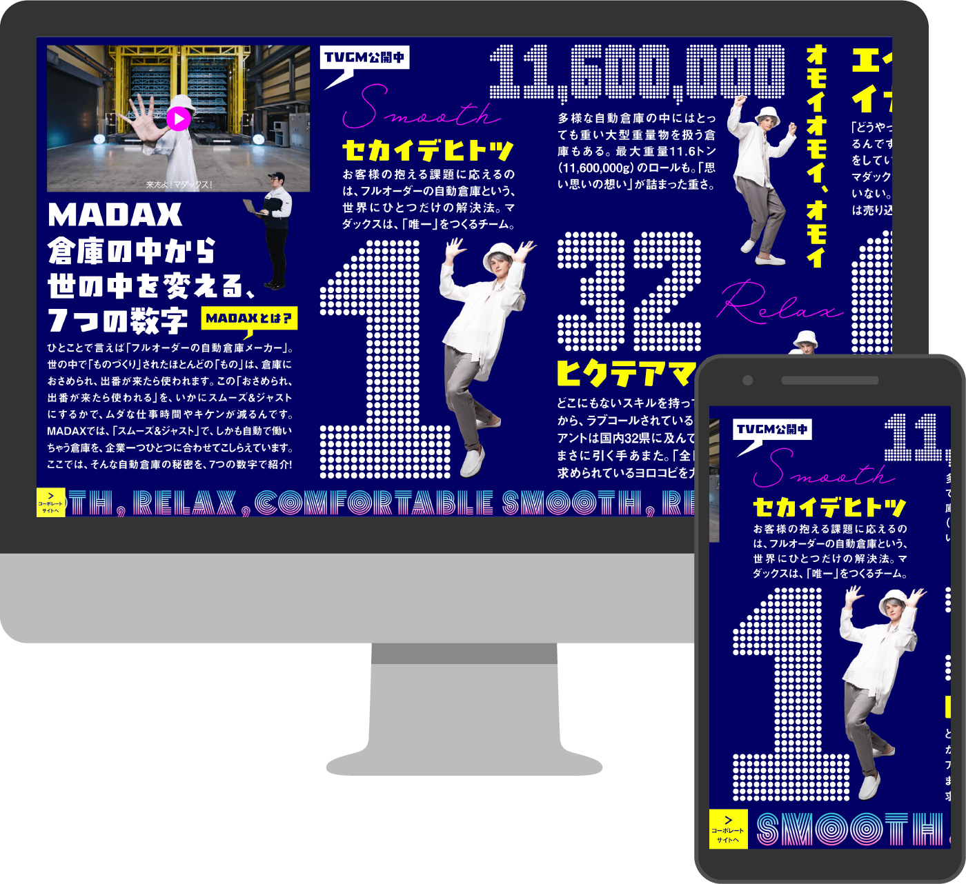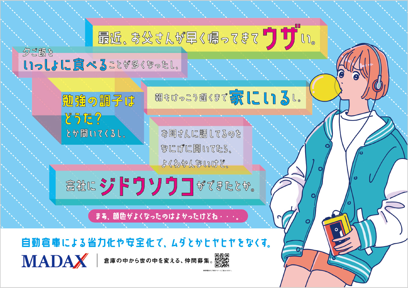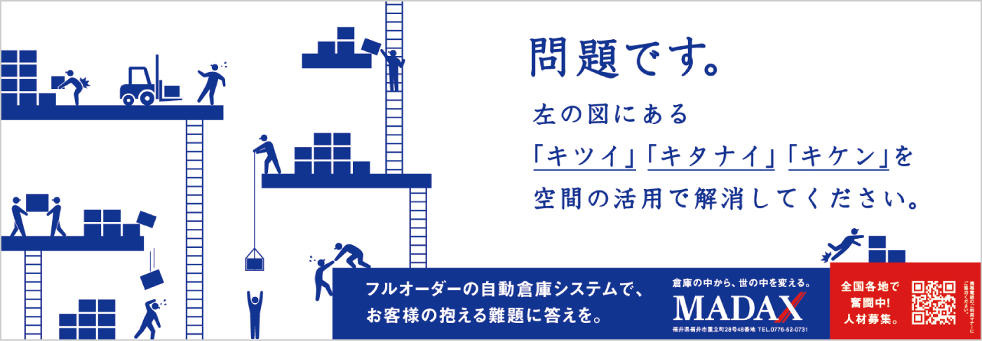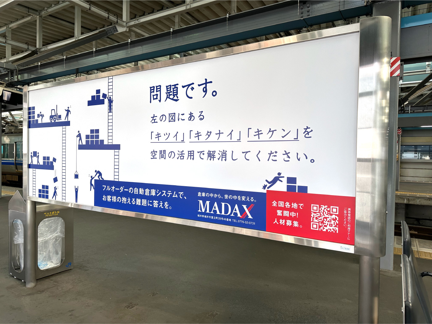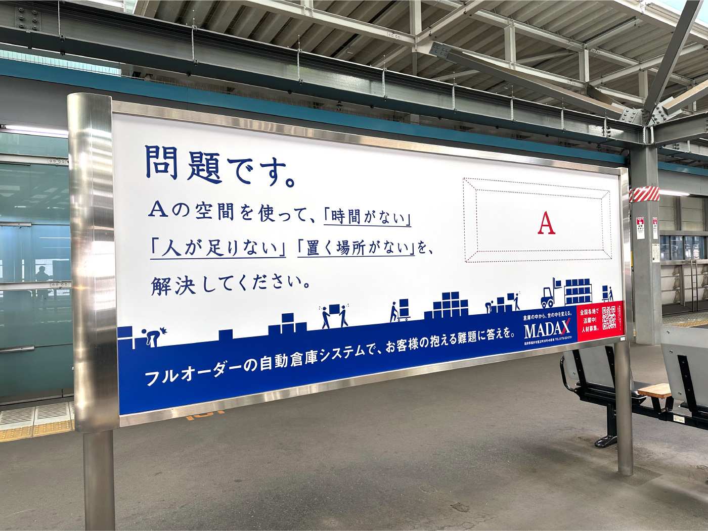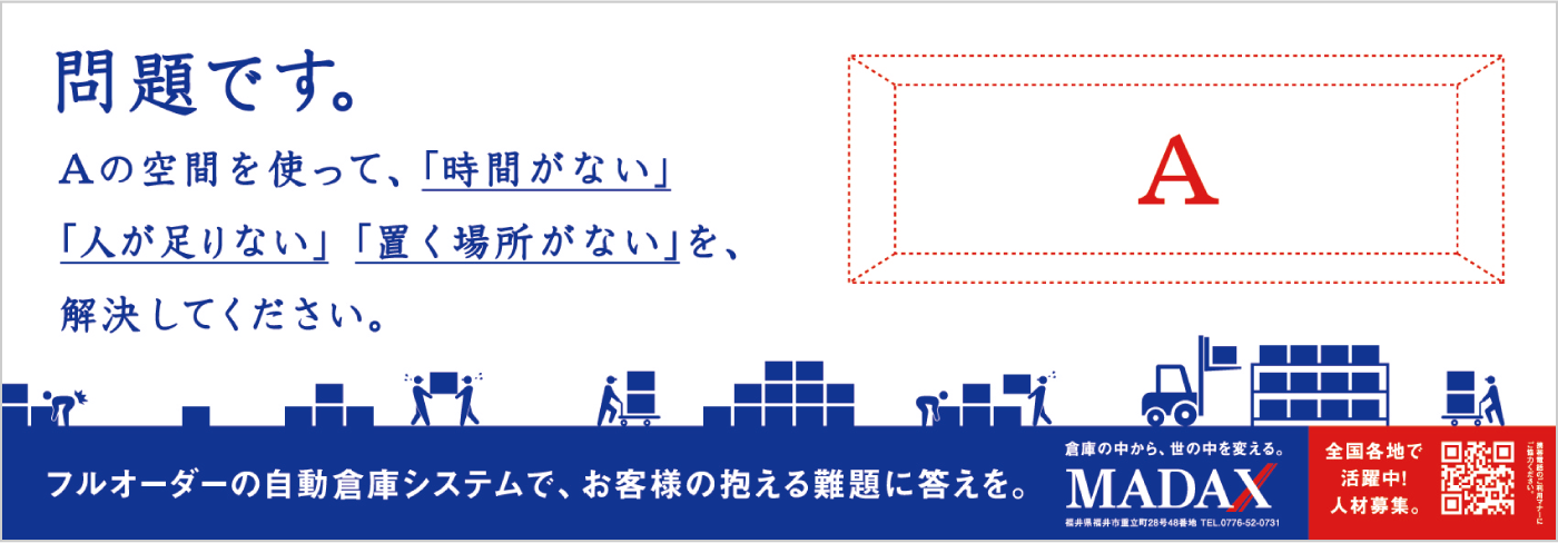 なかなか想像する機会がないかもしれませんが、確実に社会の動きを支えています。マダックスが行っているのは、倉庫や工場内空間のソリューションです。いま、製造業において、商品の多様性に合わせた生産体制の構築や人手不足、安全作業の確立など、倉庫内における製品の保管・搬送には様々な課題が山積しています。今回、そんな、倉庫内の問題を空間の利用で解決するマダックスの、採用プロモーションのお手伝いを実施しました。まずコンセプトづくりから始まりました。倉庫の空間解決が何をもたらすのか。顧客の生産をスムーズにすれば、その顧客につながる会社の売上向上などメリットにつながります。空間を新たに確保することで別のアクションを倉庫内に生み出せば、新事業が世の中に別の角度でインパクトをもたらすかもしれません。また、社員の安全を確保すれば、家で待っている家族の安心を生みます。このことを、「倉庫の中から、世の中を変える。」というブランドスローガンを創出。広告ではまず、ターゲットの身近な交通機関である電車関連に展開しました。構内サインで倉庫内を視覚化するビジュアルを制作し、次に電車内壁面ポスターでは、父の変化を見つめる娘の気持ちを発信、さらにTVCMでは、商品を擬人化し、わかりにくい業務内容をシンプルに理解できるよう努めました。また、特徴ある動きで観る人に濃い印象を残すことを目指しました。